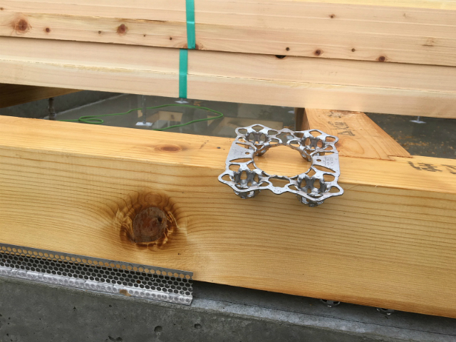 私は基礎コンクリートと土台の間に敷く基礎パッキンを多くの住宅で採用されているプラスチック製では無く、数万円コストアップしますがステンレス製品を採用しました。そして下の写真の土台の前に取り付けて有る防鼠材もステンレス製にしました。