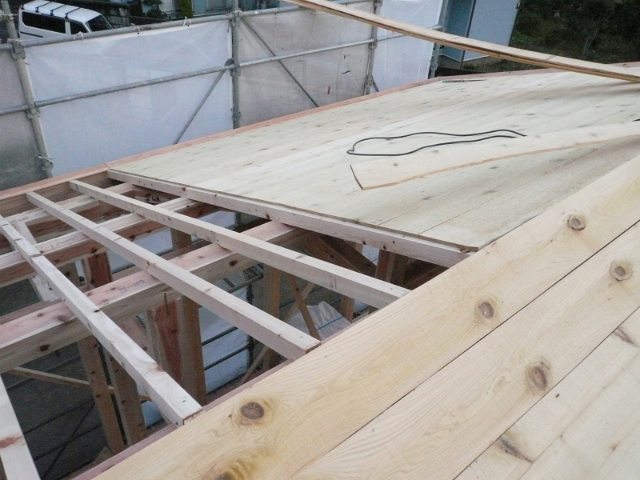 1階の床は合板を使用せず桧の垂木を並べ下張りに桧の巾はぎ板を貼りました。この写真は桧の板を貼った写真です。桧の巾はぎ板を斜めに貼り仕上げの無垢フローリングの動きを抑え工夫がなされています。