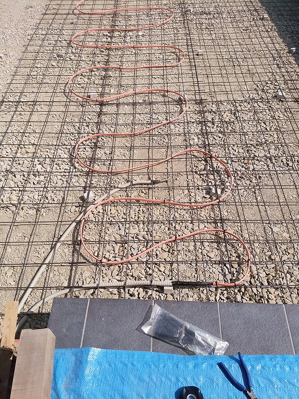 住宅会社の方から雪が積もる地域なのでカーポートの設置を提案されたのですが、新しい家の前に無粋なカーポートが有るのが良いとは思えず、それでも雪が積もるのも困るので悩んだ結果、次の写真で分かるように融雪ヒーターをコンクリートに埋め込みました。