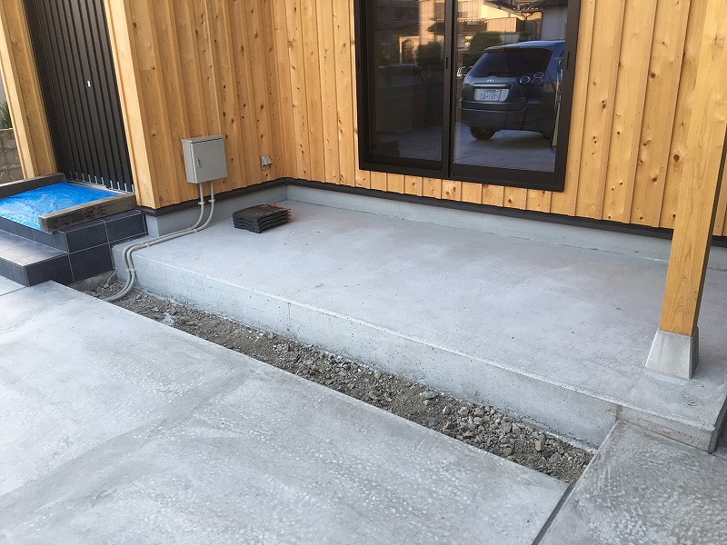 以前住んでいた家では外周部に雑草が生え手入れに苦労していたので、今回は僅かな植栽部分を残して全てコンクリートにしました。