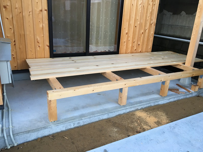 LDKの掃き出し窓の前にウッドデッキを作ろうと思い1.5m程の庇を付けて貰らいました。その庇の下にDIYウッドデッキを作りました。材料は全て30年経っても腐る事が無い能登ヒバです。能登ヒバが腐る前に金物がダメになるかもしれません。