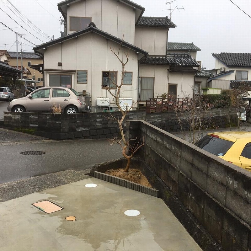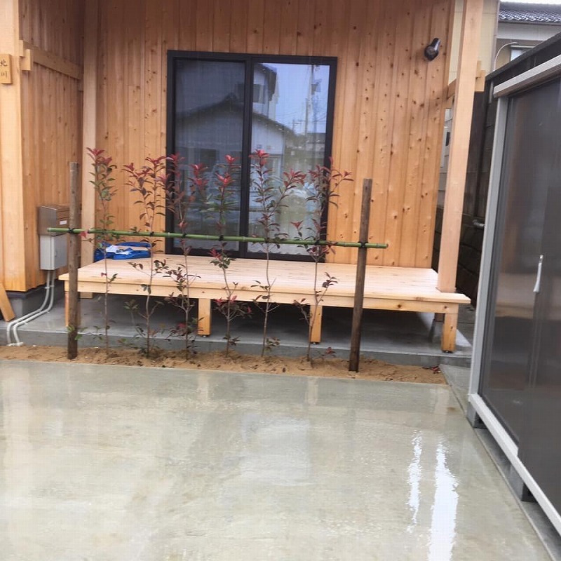 植栽工事は近くに有る森林組合が経営する園芸店行きに、主木に枝振りが格好いい百日紅を選び、目隠し用にレッドロビンに決めました。サービスで配達して貰い自分で植えました。